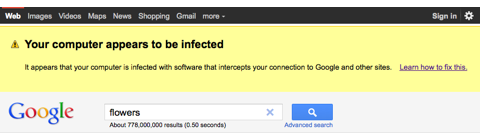 Чтобы проверить, заражен ли Ваш компьютер, введите любой поисковый запрос на google.com и проверьте, не появилось ли у Вас уведомление на желтом фоне в верхней части страницы с результатами поисковой выдачи.